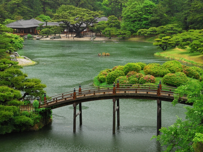 - Étangs, collines, rizières et plantations de thé en font un très agréable lieu de promenade, très étonnant par sa disposition ouverte aux vues dégagées, aux antipodes des jardins classiques japonais.