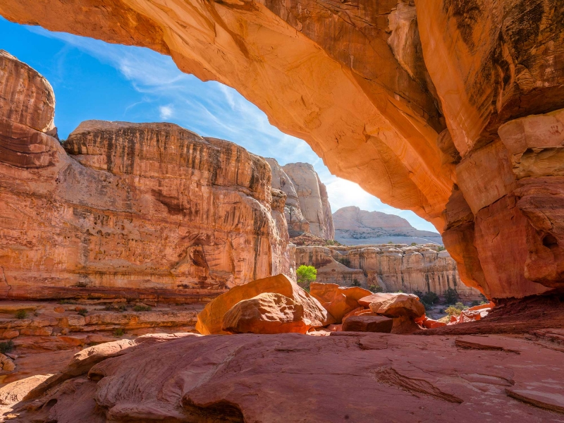 , à environ 2h30 de Bryce Canyon. En chemin, admirez les paysages changeants, avec des vues impressionnantes sur les formations géologiques et les canyons colorés de l'Utah. Vous traverserez la pittoresque Route 12, l'une des routes les plus belles et les plus célèbres des États-Unis, offrant des panoramas spectaculaires sur la nature sauvage de l'Utah.Capitol Reef National Park est un trésor caché de l'Utah, caractérisé par des formations géologiques impressionnantes et des paysages d'une beauté saisissante. Le parc tire son nom du Waterpocket Fold, une crête de plus de 160 kilomètres qui s'étend à travers le parc, créant des falaises, des canyons et des mesas spectaculaires. Ces formations rocheuses, combinées aux couleurs rouges et oranges, offrent des vues inoubliables, particulièrement au lever et au coucher du soleil.