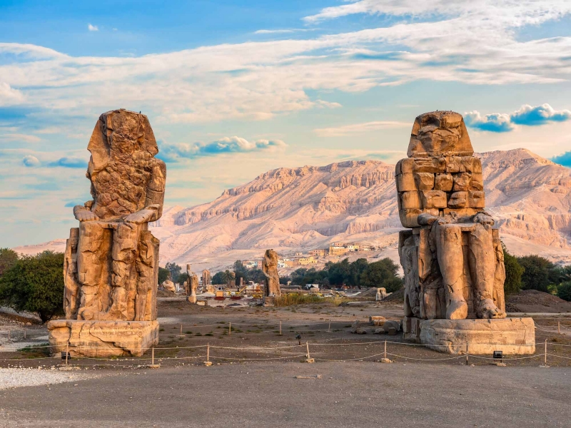 levez les yeux vers les bas-reliefs qui habillent les murs.S’élevant majestueusement, le colosse de Memnon est le gardien silencieux de ce site éblouissant.